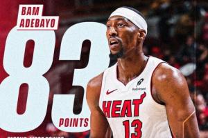 体育资讯03月12日讯 热火主场150-129大胜奇才,阿德巴约狂轰83分创历史单场第二高分。